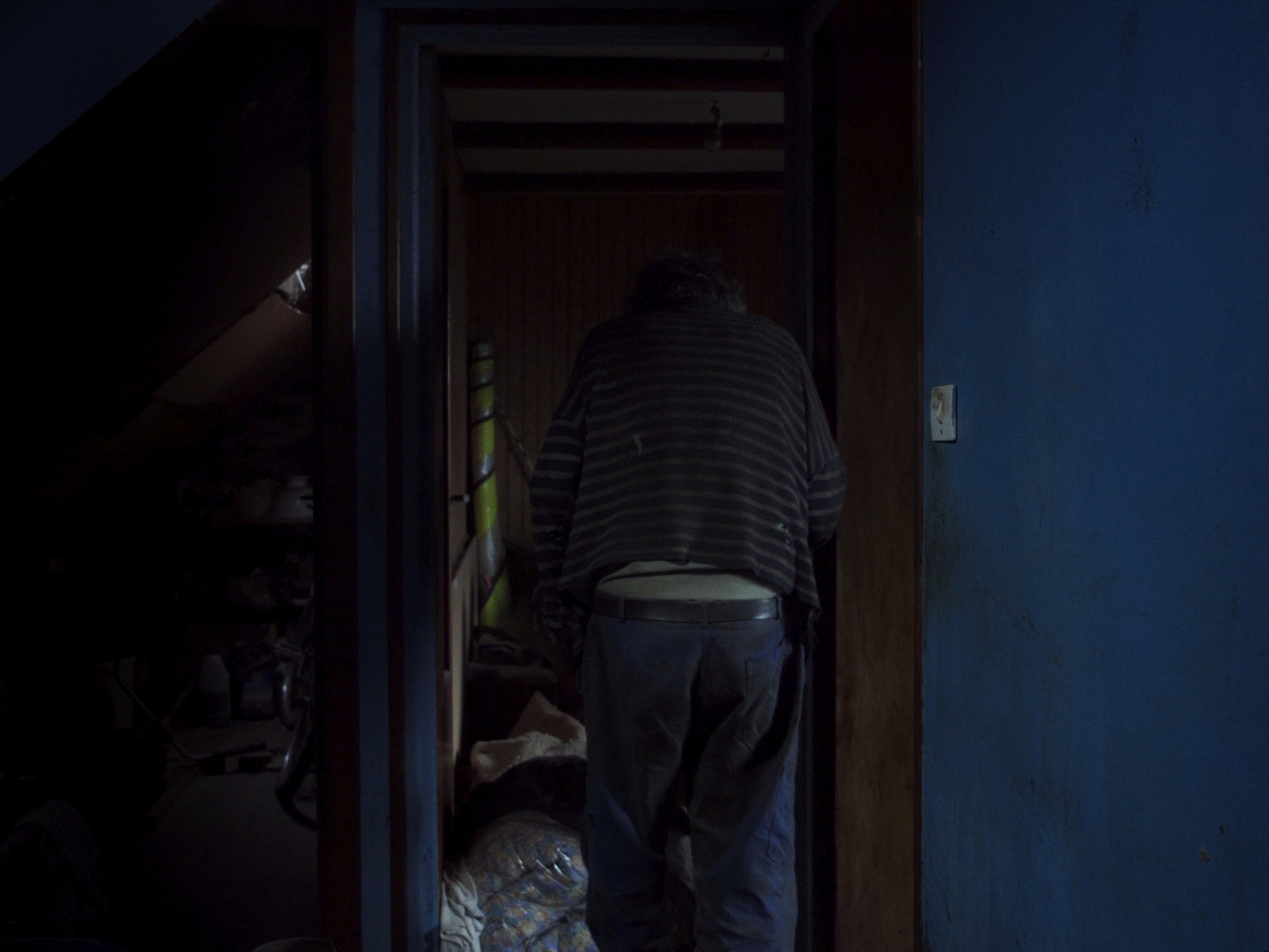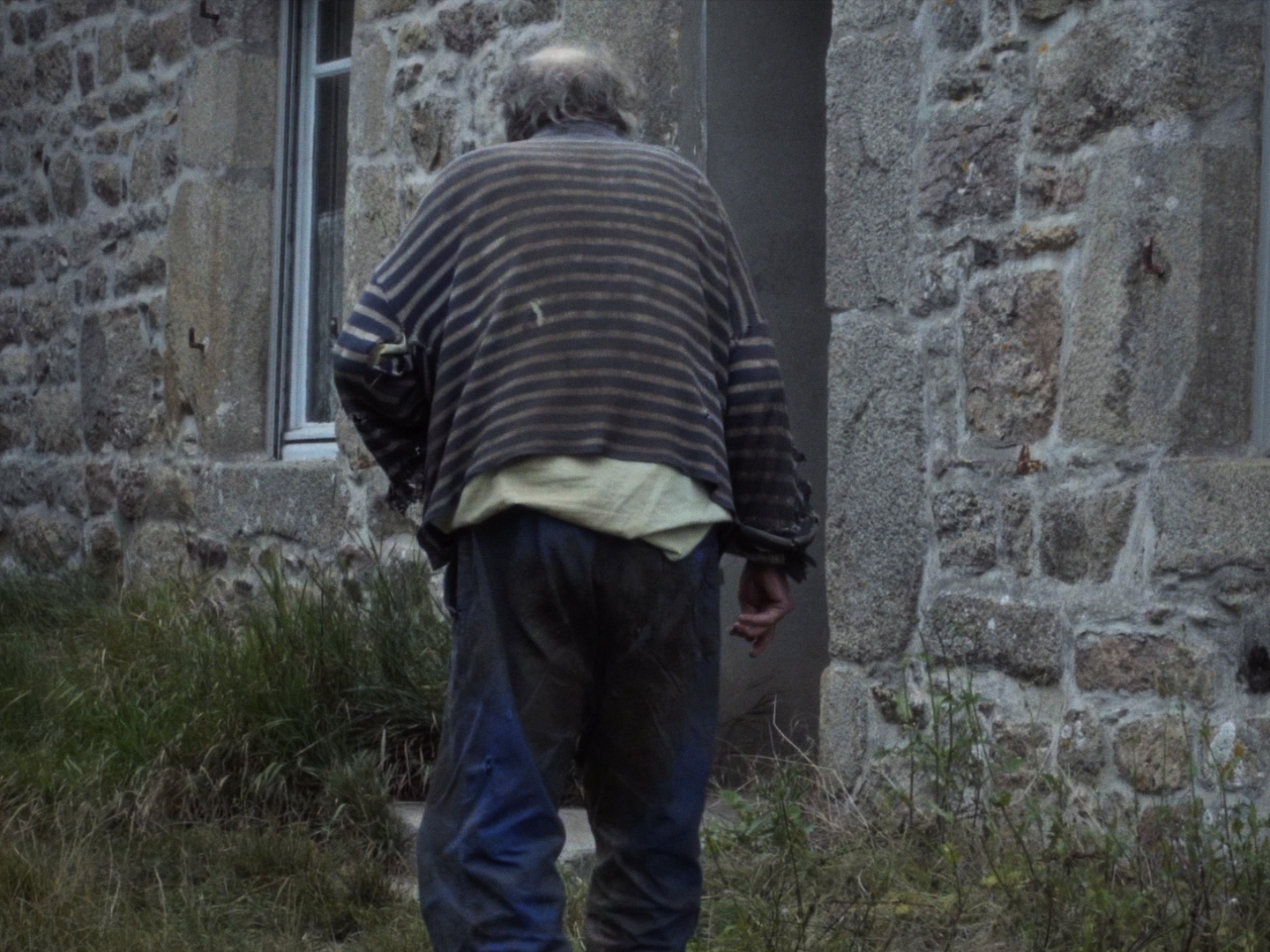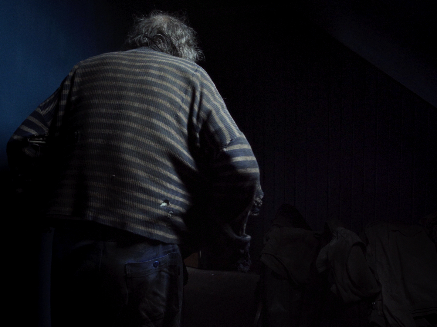 Une maison, quelque part. En France, probablement à la campagne : quelques indices nous renseignent, comme l’âge et le style des meubles, ou la présence d’un lapin. C’est maigre, et devant la sécheresse radicale de ce court film pas vraiment hospitalier, on comprendrait que le spectateur s’offusque d’être traité avec si peu d’égards. Robert Taschen ne lui apprendra rien, n’a rien à lui dire. Le portrait qu’il fait à peine est celui de l’homme qui habite la maison. Seul, de toute évidence, tout comme il est évident que ce n’est pas une solitude ordinaire, et qu’une longue dérive a fait de lui un naufragé, très loin des côtes de la vie normale, chose que le spectateur, sans trop de difficulté, déduira à la fois de l’attitude de l’homme et des loques qu’il a sur le dos, véritablement des loques, une chemise sèche comme du carton et qui dégueule par les trous béant d’un pull dont les rayures ont disparu sous plusieurs générations de crasse. Dans sa maison qui est dans le même état que lui, il s’occupe, indifférent à la caméra, il bricole, puis marmonne, grignote une tranche de pain blanc, plie et replie ses draps qui sont d’autres loques, marmonne encore, pèle une pomme. Que nous veut donc ce film qui ne pense pas à nous, avec son personnage qui ne pense pas au film ? Différentes choses, qui autorisent à malmener un spectateur – des choses que le film fait, pendant qu’il ne dit rien. Par exemple : donner à entendre quel bruit ça fait, une pareille solitude, et quel genre de silence. Ou encore : trouver le moyen, pour conclure après huit minutes sèches comme la pierre, d’emmener ce tas puant de réel jusqu’à des hauteurs de conte, sous une nuit bleu, en suivant un lapin.