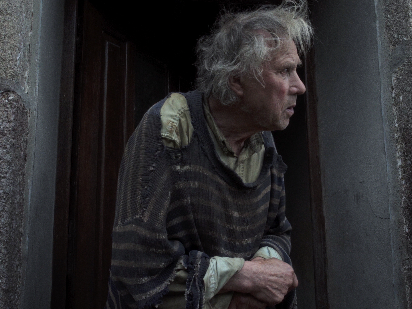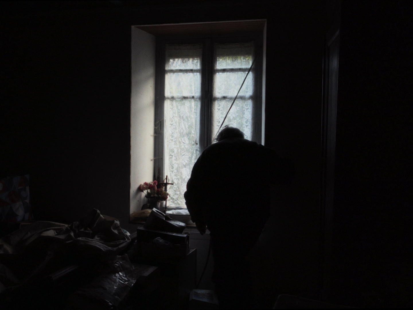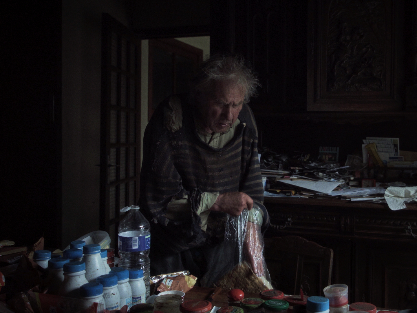 Une maison, quelque part. En France, probablement à la campagne : quelques indices nous renseignent, comme l’âge et le style des meubles, ou la présence d’un lapin. C’est maigre, et devant la sécheresse radicale de ce court film pas vraiment hospitalier, on comprendrait que le spectateur s’offusque d’être traité avec si peu d’égards. Robert Taschen ne lui apprendra rien, n’a rien à lui dire. Le portrait qu’il fait à peine est celui de l’homme qui habite la maison. Seul, de toute évidence, tout comme il est évident que ce n’est pas une solitude ordinaire, et qu’une longue dérive a fait de lui un naufragé, très loin des côtes de la vie normale, chose que le spectateur, sans trop de difficulté, déduira à la fois de l’attitude de l’homme et des loques qu’il a sur le dos, véritablement des loques, une chemise sèche comme du carton et qui dégueule par les trous béant d’un pull dont les rayures ont disparu sous plusieurs générations de crasse. Dans sa maison qui est dans le même état que lui, il s’occupe, indifférent à la caméra, il bricole, puis marmonne, grignote une tranche de pain blanc, plie et replie ses draps qui sont d’autres loques, marmonne encore, pèle une pomme. Que nous veut donc ce film qui ne pense pas à nous, avec son personnage qui ne pense pas au film ? Différentes choses, qui autorisent à malmener un spectateur – des choses que le film fait, pendant qu’il ne dit rien. Par exemple : donner à entendre quel bruit ça fait, une pareille solitude, et quel genre de silence. Ou encore : trouver le moyen, pour conclure après huit minutes sèches comme la pierre, d’emmener ce tas puant de réel jusqu’à des hauteurs de conte, sous une nuit bleu, en suivant un lapin.